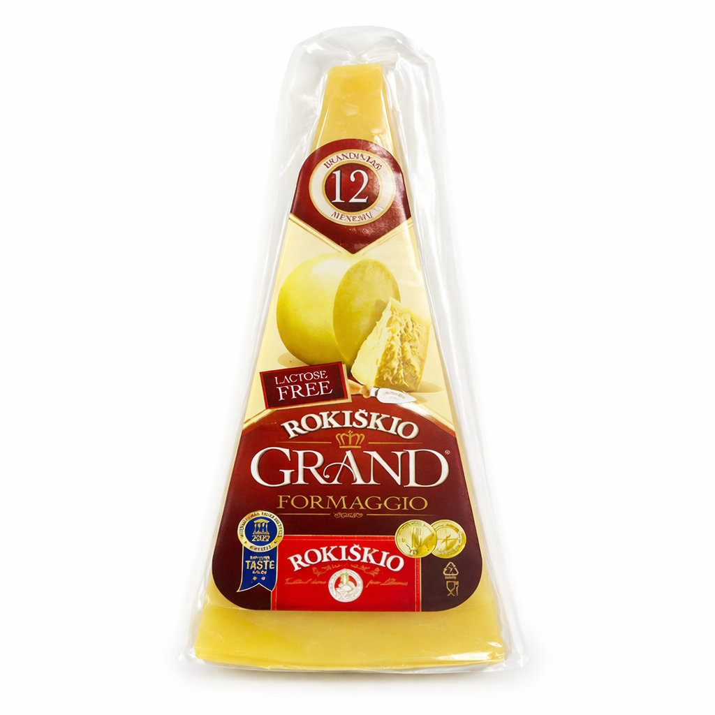 Rokiškio Grand Formaggio je tvrdý zrající sýr bez laktózy, který zraje po dobu 12 měsíců a nabízí plnou, vyváženou chuť inspirovanou italským stylem tvrdých sýrů. Díky dlouhému zrání má pevnou, ale přesto příjemně krémovou strukturu a jemně nasládlý dozvuk.
